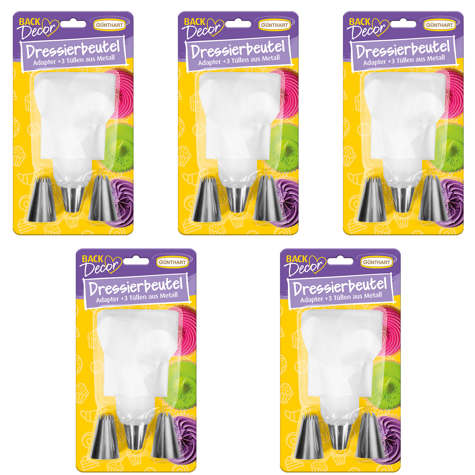 Dekorieren wie ein Profi: Mit dem Spritzbeutel-Set von Günthart BackDecor, bestehend aus 5 sets a 5 stabilen Einwegbeuteln und 3 wiederverwendbaren Tüllen, gelingt jede Verzierung im Handumdrehen. Ideal für Cremes, Sahne, Ganache und mehr – ein praktisches Set für kreative Hobbybäcker und Dekorationsliebhaber.
